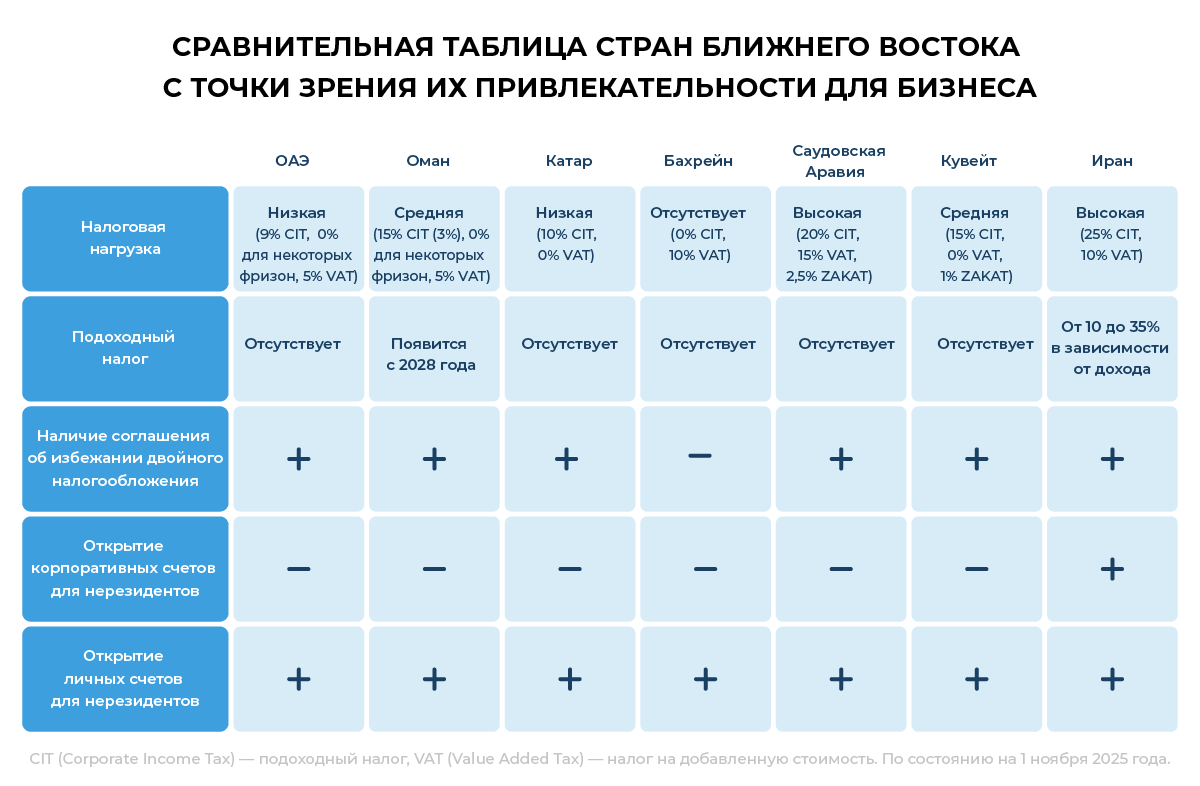 Ближний Восток сочетает умеренную налоговую нагрузку, стабильную экономическую политику и развитые финансовые центры. Поэтому местные юрисдикции становятся удобной «точкой сборки» для структурирования активов в Азии, Африке, СНГ и даже Европе. Их привлекательность усиливает доступ к финансовым инструментам, гибкие визовые программы, специальные режимы для семейных офисов и отсутствие валютного контроля. При этом регион активно адаптирует регулирование под стандарты международного налогового комплаенса, что позволяет выстраивать устойчивые и легальные холдинговые структуры.