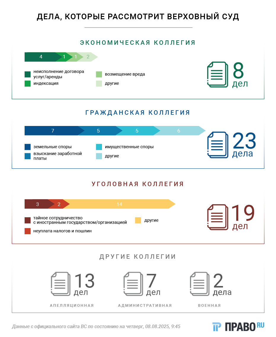 На этой неделе Верховный суд рассмотрит 72 жалобы. Экономколлегия займется делом арбитражного управляющего, которому отказали в возмещении расходов на юриста после поступившей в Росреестр анонимной жалобы. Другой спор в коллегию передал ее зампред. В нем с охранного предприятия взыскали деньги за услуги по госконтракту, так как их оплатили по неверной статье бюджета. Еще суд изучит две жалобы об индексации долга: одна попала в коллегию по экономическим спорам, другая — в гражданскую. В обеих спор идет о сроках подачи такого заявления.