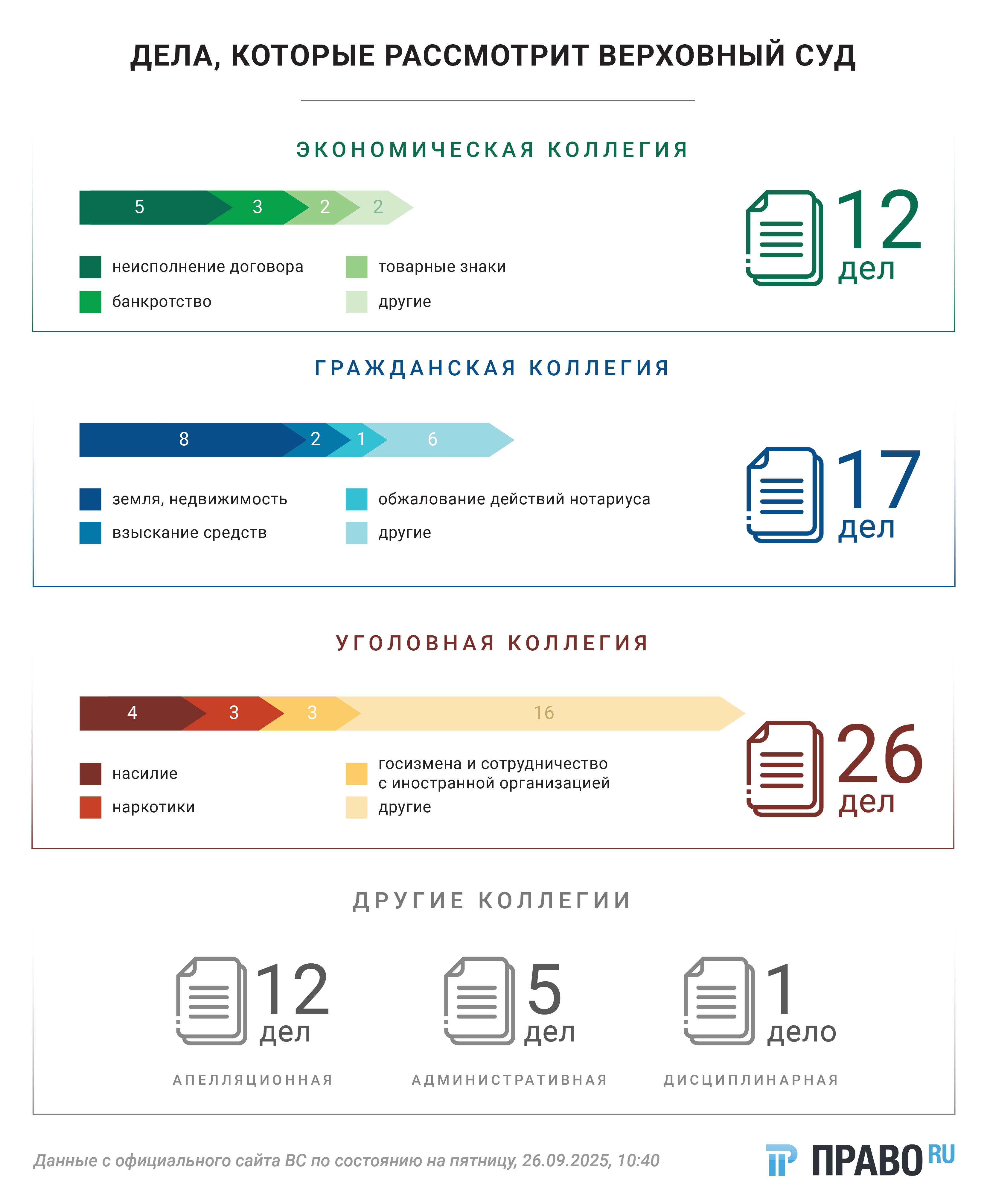 В коллегии по административным делам пять жалоб. Одна из них судейская. Бывший зампред Четвертого кассационного суда общей юрисдикции Яков Волков обжалует июльский отказ ВККС (дело № АКПИ25-682). Коллегия не стала отменять ему дисциплинарное взыскание за нарушение судейской этики, вынесла предупреждение и прекратила полномочия Волкова как зампреда, оставив статус судьи. Основные претензии заключались в том, что, возглавляя гражданскую коллегию, тот самоустранился от руководства, а это ухудшило качество работы. Кроме того, судья не рассмотрел ни одного дела в своей должности, увеличив нагрузку на других судей.