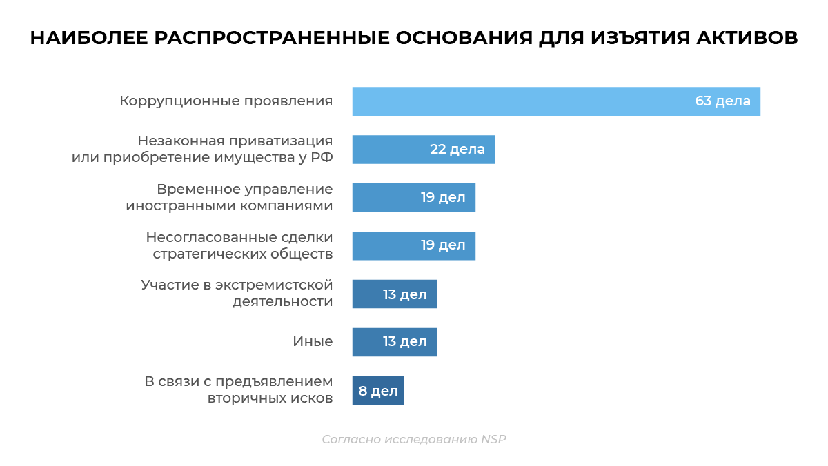 Согласно исследованию Nektorov, Saveliev & Partners (NSP) , в 2025 году суды изъяли активы на сумму 3,12 трлн руб., что в 4,5 раза превышает показатель 2024 года (около 690 млрд руб.). Самыми дорогими национализированными активами стали аэропорт Домодедово (1 трлн руб.), холдинг KDV Group (0,5 трлн руб.) и «Южуралзолото» с аффилированными компаниями (0,4 трлн руб.), при этом больше всего исков подали по антикоррупционным основаниям, а по стоимости изъятий лидировали стратегические общества — 1,26 трлн руб.