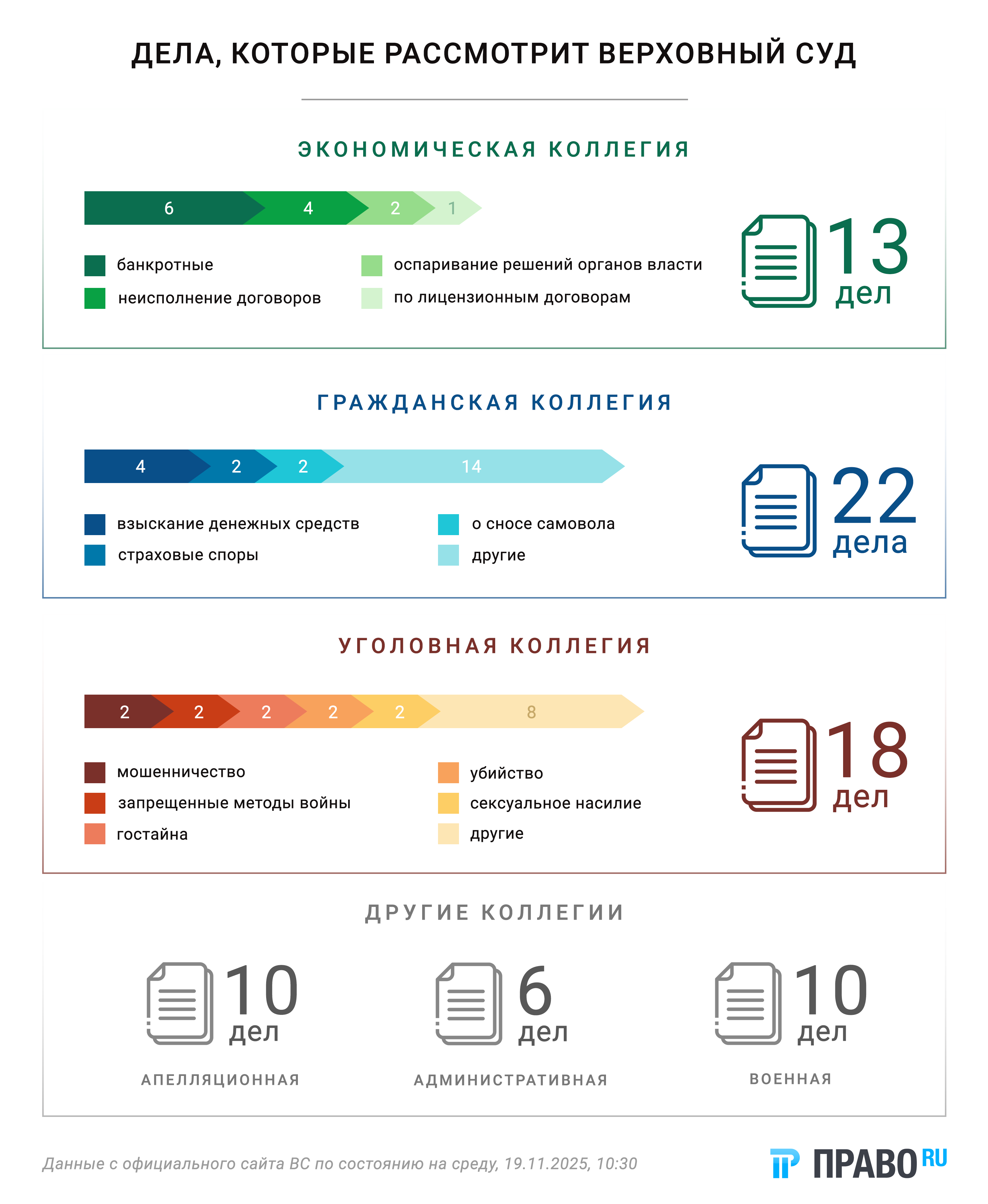 Президиум и дисциплинарная коллегия на этой неделе не соберутся. Интересные споры есть в гражданской. Прокуратура требует изъять десять многоквартирных домов, которые, по ее мнению, построили на взятки, полученные экс-главврачом Пятигорской больницы Родионом Филенко* (дело № 19-КГПР25-17-К5). Первая инстанция и апелляция отказали, потому что прокурор не представил прямых доказательств, что именно Филенко финансировал строительство. Кроме того, второй и последующие дома возводили уже на прибыль от продажи квартир в первом доме, то есть их строительство профинансировано из легального источника. Кассация отменила судебные акты в части отказа в изъятии первого дома или его стоимости и направила дело на новое рассмотрение в этой части. По девяти другим домам прокуратуре отказали. Этот вопрос коллегия рассмотрит 25 ноября.