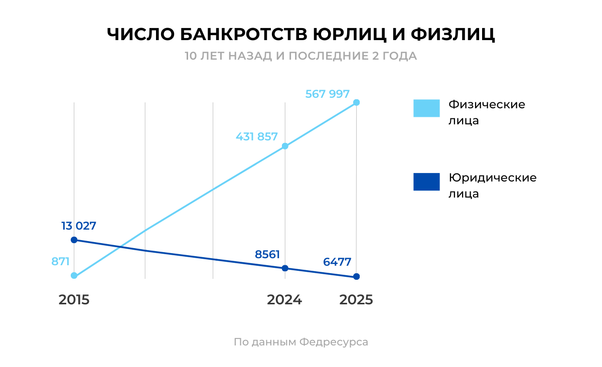 Количество процедур в отношении граждан и ИП продолжает расти. В 2015 году таких дел было всего 871, в 2024-м — 431 857, а в 2025-м — 567 997. Федресурс отмечает: за последние три года прирост держится на уровне 20–30% в год, тогда как в первые пять лет после запуска процедуры он достигал 50–70%.