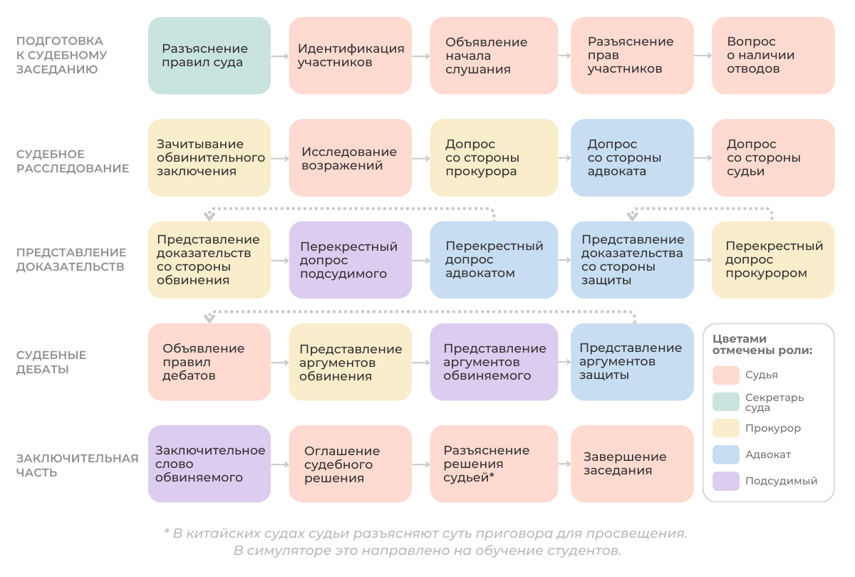 Подробнее процесс показан на иллюстрации ниже. Цвета обозначают роли, задействованные в разных фазах судебного заседания. Пунктирные стрелки — возможный возврат к предыдущей фазе (при необходимости). Например, на стадии дебатов система может периодически напоминать о правилах их проведения.