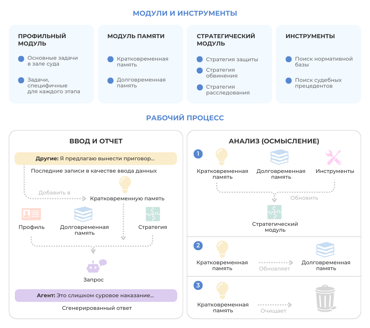 Модуль «Профиль» помогает агенту понять его роль и цель, модуль «Память» отслеживает ход судебного процесса, а модуль «Стратегия» помогает ему разрабатывать планы и генерировать соответствующие ответы. Агенты построены на основе общих языковых моделей (large language models, LLM) со специализированными знаниями. Каждый агент может обращаться к нормативной и судебной базе, что позволяет им моделировать разные судебные роли. В нормативную базу входит 55 347 законов, в том числе все уголовное законодательство КНР. Судебная база построена на основе коммерческой системы LegalOne, которая содержит 2 млн юридических документов и 200 000 дел, отобранных Верховным народным судом Китая.