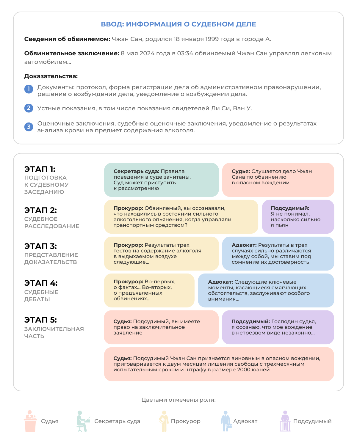 Подробнее процесс показан на иллюстрации ниже. Цвета обозначают роли, задействованные в разных фазах судебного заседания. Пунктирные стрелки — возможный возврат к предыдущей фазе (при необходимости). Например, на стадии дебатов система может периодически напоминать о правилах их проведения.