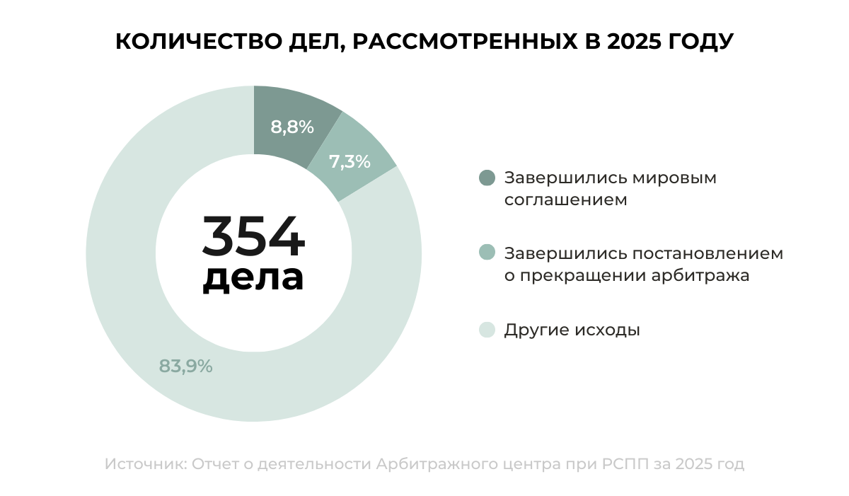 Арбитражный центр при РСПП рассмотрел за прошлый год 354 дела. Мировым соглашением завершился только 31 спор, тогда как в 2024-м дел с таким исходом было 77. Еще 26 разбирательств закончились постановлением о прекращении арбитража. В этом случае истцы чаще всего сами отказывались от требований, зачастую из-за добровольного исполнения ответчиками своих обязательств после начала арбитража.