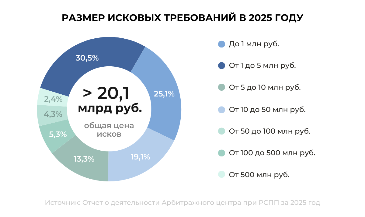 Одновременно существенно снизилась общая цена исков. В 2024 году их совокупный размер составлял около 101,8 млрд руб., а в 2025-м — только 20,1 млрд руб. Крупные споры, требования по которым больше 500 млн руб., занимают в Арбитражном центре при РСПП всего 2,4% от общего числа дел. Небольшие иски до 1 млн руб., напротив, распространены: на них приходится 25,1%. Наиболее часто встречаются требования на сумму от 1 до 5 млн руб. — это 30,5% от всего числа заявлений.