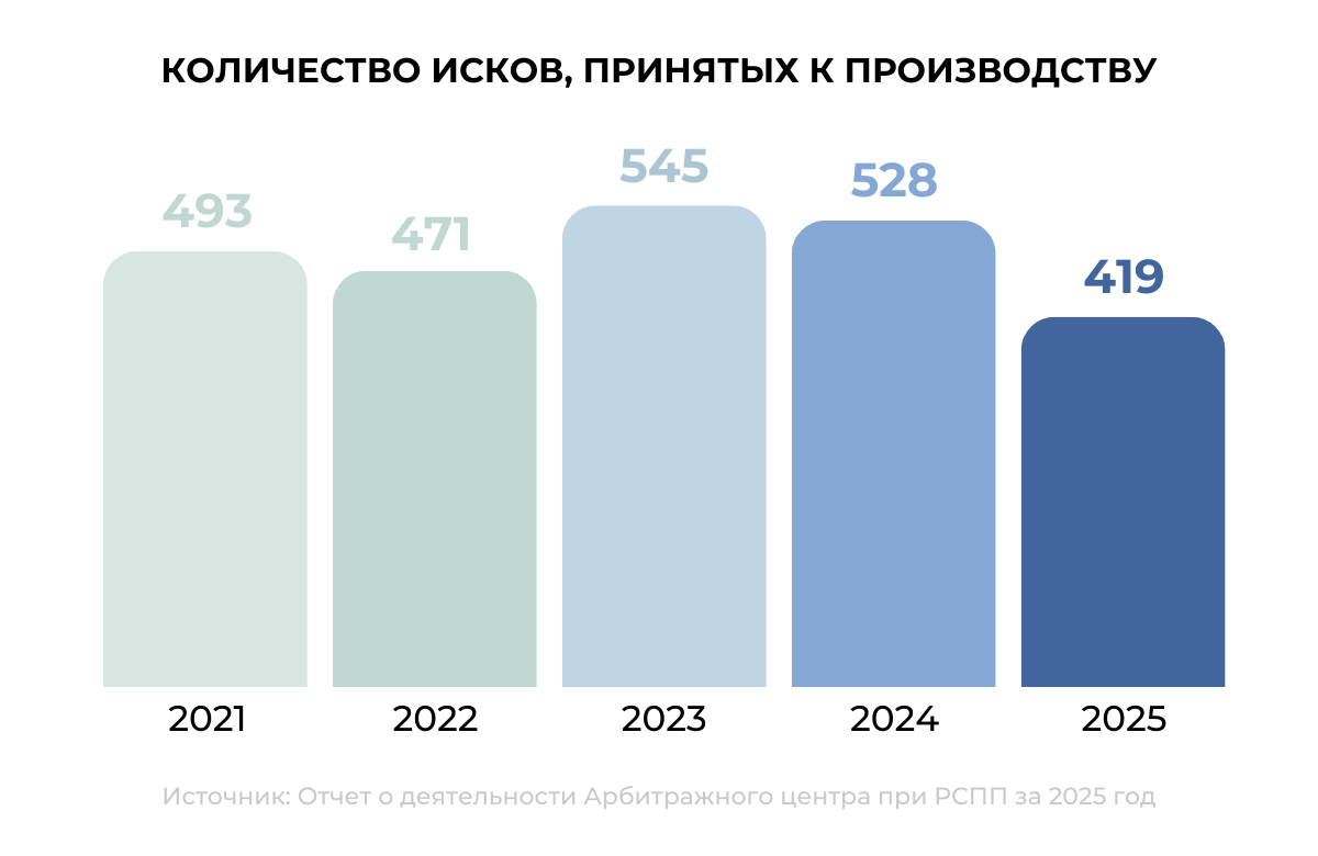 За 2025 год Арбитражный центр при Российском союзе промышленников и предпринимателей принял к производству 419 исков. Это рекордно низкий показатель за последние пять лет. Так, в 2021 году заявлений было 493, к 2023-му их количество достигло самого высокого значения и составило 545, а уже в 2024-м показатель стал снижаться и остановился на отметке 528.
