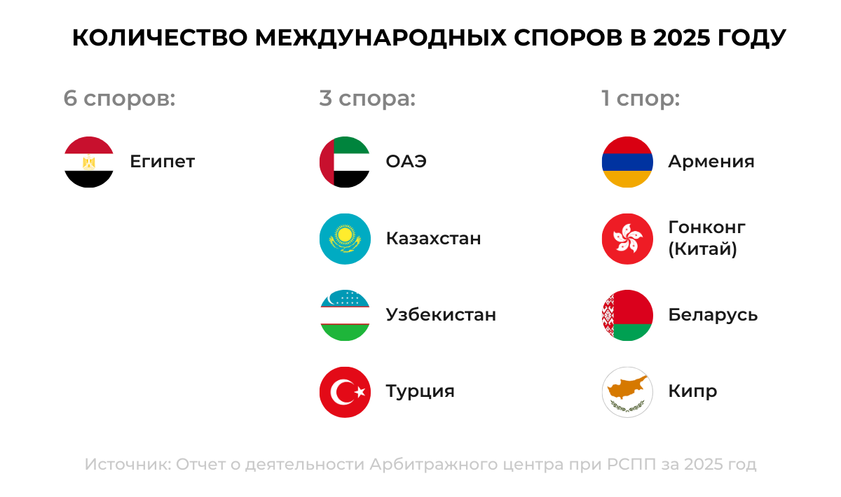В то же время международных споров стало больше: в 2025 году Арбитражный центр при РСПП принял к производству 22 международных иска против 16 в 2024-м. По мнению управляющего директора — руководителя аппарата Арбитражного центра при РСПП Александра Замазия, это стало успехом института за минувший год.
