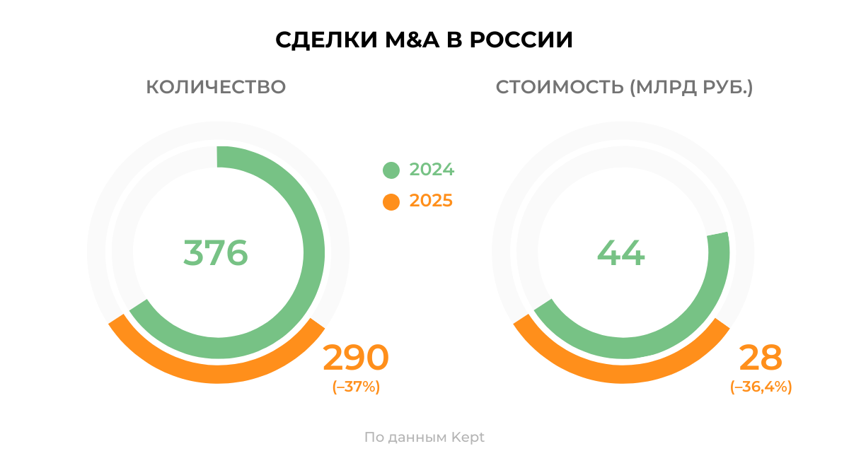 Партнер Kept Денис Суровцев в базовом сценарии на 2026 год ожидает, что M&A активность останется невысокой. Снижение активности на российском рынке предвидит и Артем Тамаев, партнер корпоративной практики Better Chance Высокая ключевая ставка и недавние изменения в налогах не способствуют изменению текущего тренда, считает эксперт.