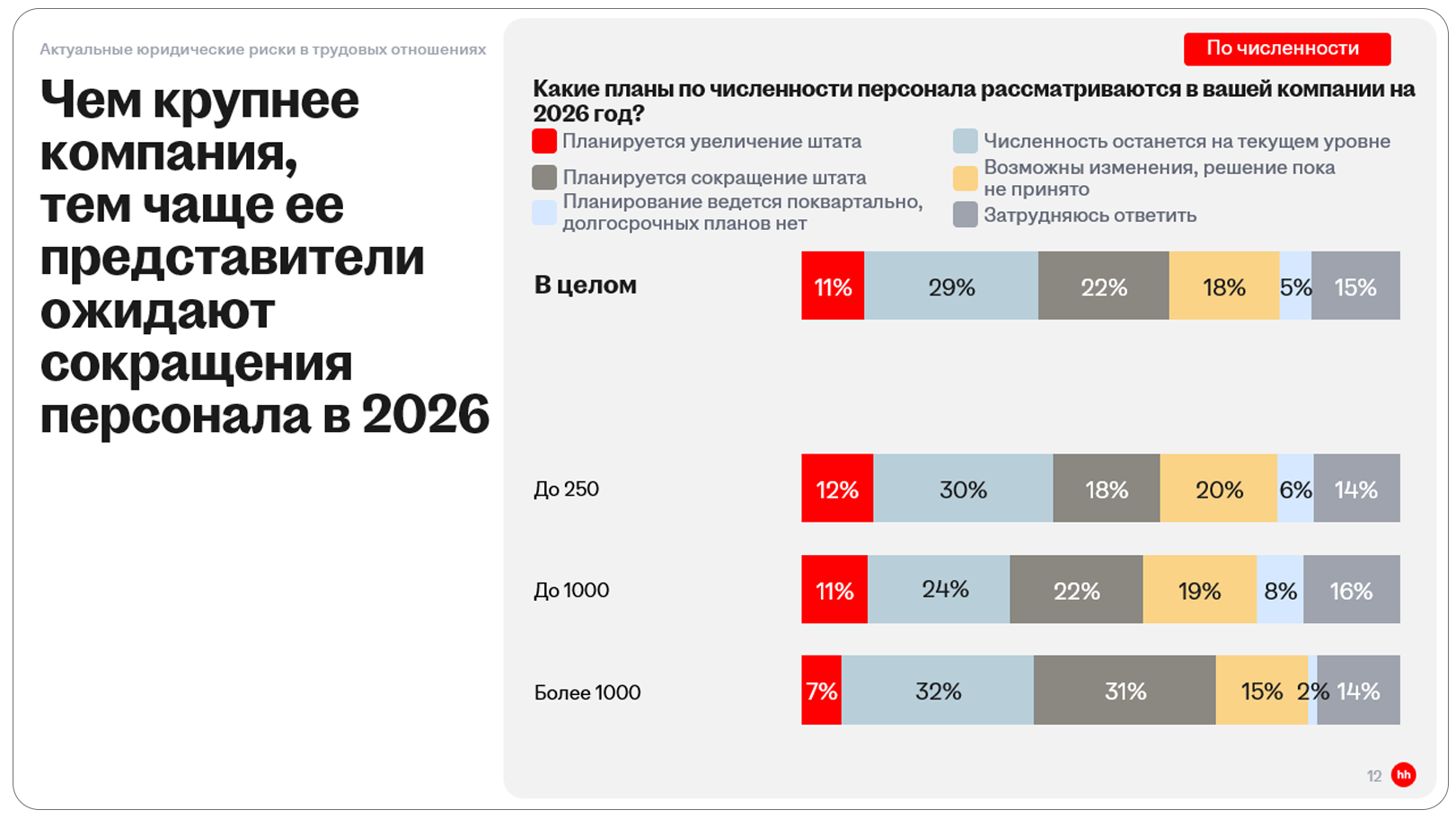 Что касается планов на этот год, то три из десяти компаний не ожидают изменений в численности сотрудников, хотя каждый четвертый представитель юридического руководства прогнозирует сокращение штата. Чем крупнее компания, тем чаще ее представители ожидают уменьшения персонала в ближайшем будущем.