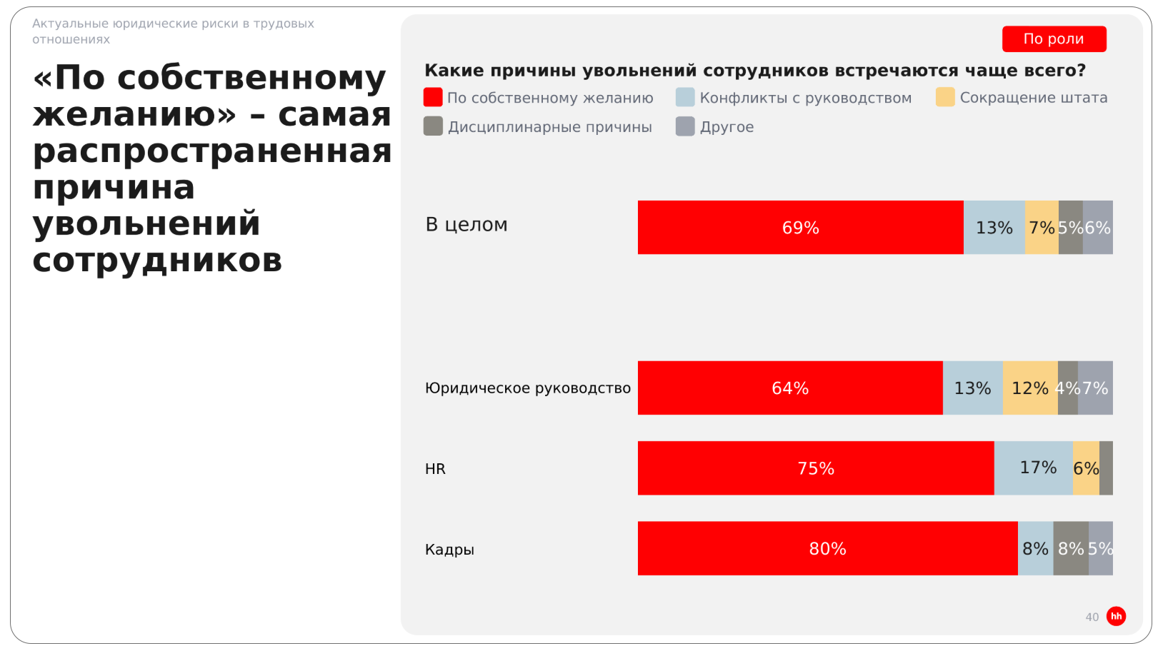 Самой распространенной причиной увольнений во всех сегментах бизнеса является уход по собственному желанию. Сокращения штата и дисциплинарные нарушения встречаются реже.