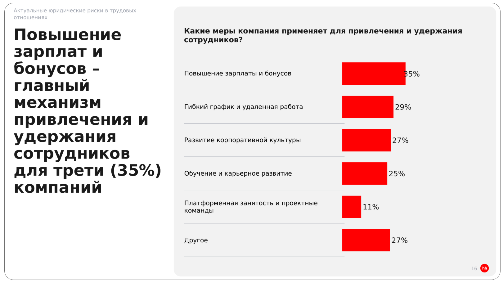 Основным механизмом привлечения и удержания сотрудников для 35% компаний остается повышение заработных плат и бонусов. В качестве дополнительных мер юридические руководители выделяют гибкий график и удаленную работу, а HR-специалисты — развитие корпоративной культуры и карьерных возможностей. Крупнейшие игроки рынка активнее инвестируют в корпоративную культуру.