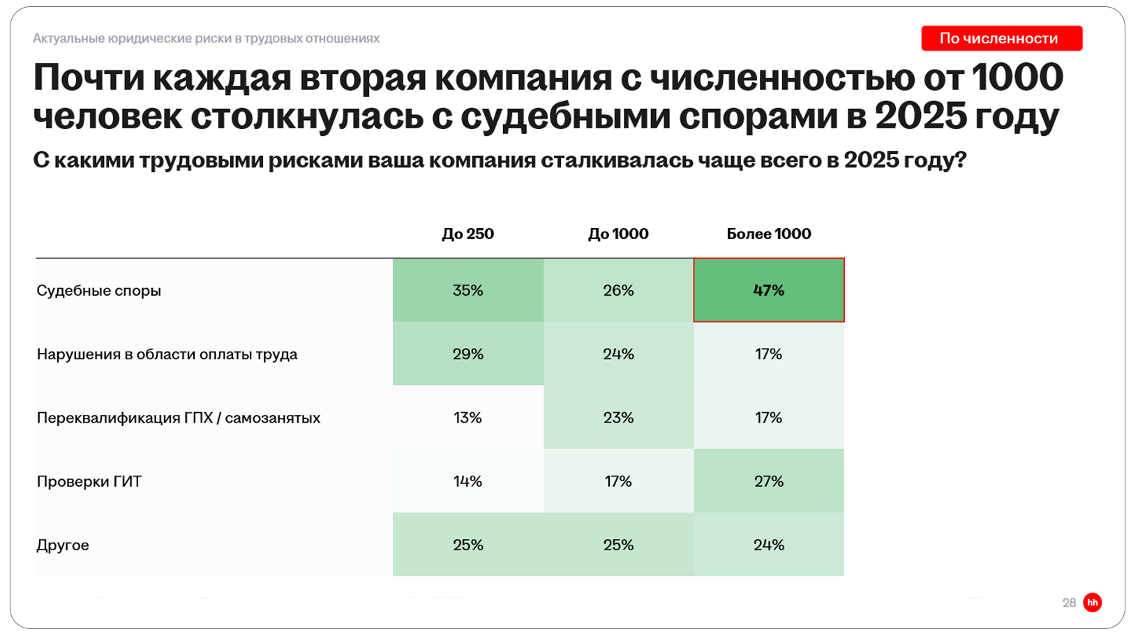 Ключевым выводом исследования стало то, что судебные споры являются самым распространенным трудовым риском 2025 года. Почти каждая вторая компания с численностью более 1000 человек сталкивалась с ними в уходящем году. Несмотря на это, у 48% компаний нет формализованных механизмов разрешения трудовых конфликтов. В малом и среднем бизнесе этот показатель достигает 51%. Самым популярным способом урегулирования разногласий остаются каналы прямой обратной связи с руководством.