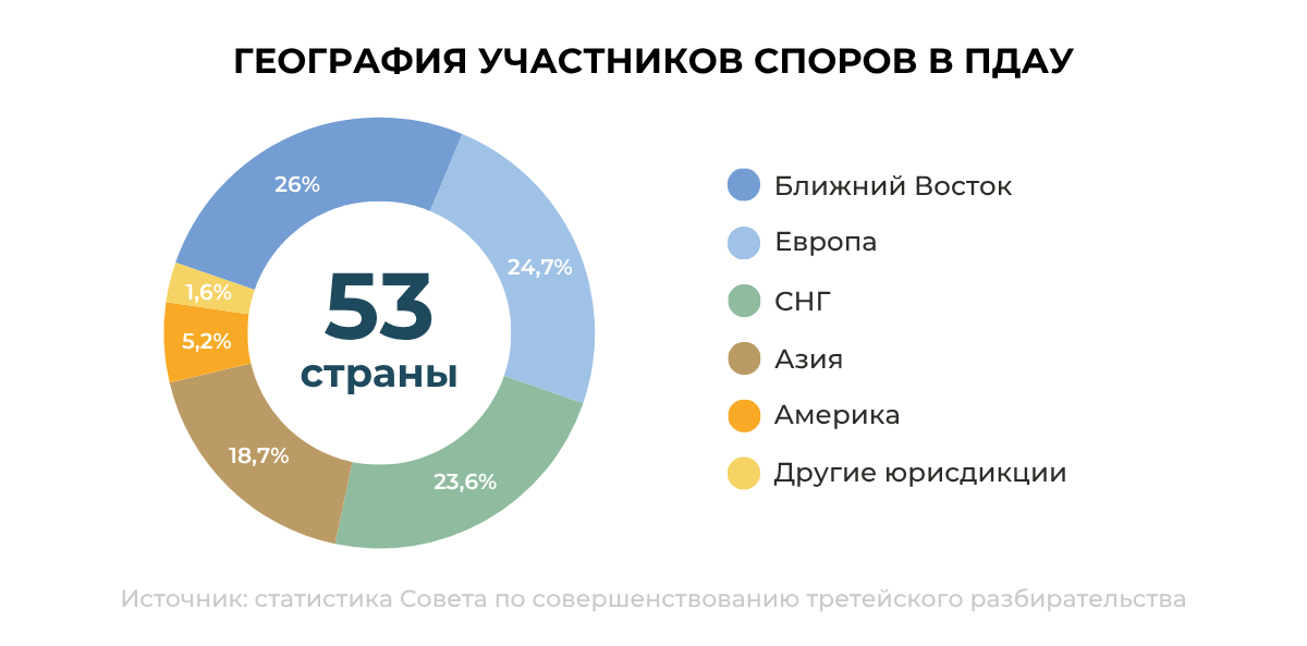 В международных спорах участвовали стороны из 53 стран (против 55 стран в 2024 году). Это компании с Ближнего Востока (26,1%), из Европы (24,7%), СНГ (23,6%), Азии (18,7%) и Америки (5,2%).