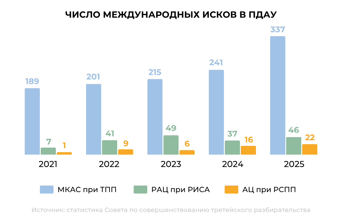 Иски 2025 года — это результат договоров, заключенных несколько лет назад, указывает юрист BIRCH Александр Гуна. Стороны в этих спорах обращались в те арбитражные учреждения, которые выбирали в течение 2020-х годов и даже раньше, отмечает эксперт. Поскольку количество дел в российских ПДАУ от года к году растет, юрист предполагает, что они вытекают из арбитражных оговорок по контрактам, которые стороны заключали после 2022-го, то есть после переориентации с иностранных на отечественные арбитражи.