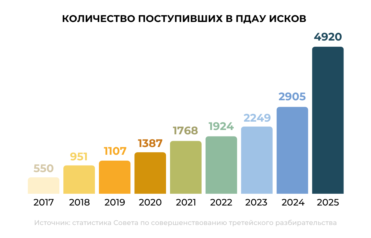 Совет по совершенствованию третейского разбирательства подготовил отчет об итогах работы за 2025 год. Отдельное внимание уделили деятельности российских постоянно действующих арбитражных учреждений (ПДАУ). В отчетный период ПДАУ получили 4920 споров — это почти на 70% больше, чем в 2024 году (тогда поступило 2904 иска). В Совете отмечают, что после проведения реформы третейского разбирательства споров стабильно поступает больше. Особенно это заметно в последние годы: в 2023-м показатель вырос в 1,2 раза, в 2024-м — почти 1,3 раза.