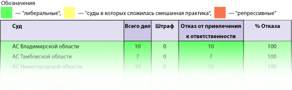 Несмотря на то, что специалисты считают практику арбитражных судов по "сочинской" тематике цельной, редакция Право.Ru решила рассмотреть отдельно практику каждого из них, чтобы выяснить, какие суды ориентированы на принятие, условно говоря, репрессивных решений, а какие — либеральных. При этом из дальнейшего исследования исключаются суды, рассмотревшие за прошедший год менее пяти "олимпийских" дел, так как, на наш взгляд, характер практики определить в таком случае затруднительно. Либеральными судами мы условно назовем те, которые вынесли решение об освобождении ответчика от административной ответственности в более, чем 66% дел. Практику арбитражей с показателем 33-66% мы будем считать смешанной, а тех, кто склонен штрафовать торговцев нелегальной атрибутикой (менее 33% решений об отказе от привлечения), признаем репрессивными.