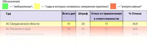 Среднюю прослойку списка составляют суды из 13 регионов (31%), из которых наиболее занят интересующими нас делами был Арбитражный суд Свердловской области, рассмотревший 41 эпизод торговли нелегальными предметами сочинской тематики (26 решений о штрафе, 15 — об отказе от привлечения). Идеальный баланс сохранил только АС Мурманской области, прощавший и штрафовавший поровну — по три раза.